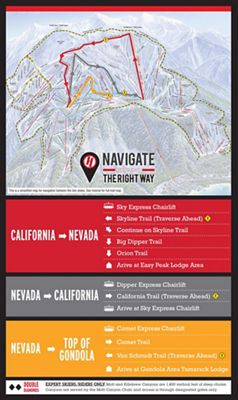Take some time to study the trail map before your trip and pay special attention to the connections between peaks. There are most notably quite a few cat tracks that connect these different areas to one another. Heavenly's website has a "Navigate Your Day the Right Way" cheat sheet that shows the major connections if you are traversing between sections of the resort.
